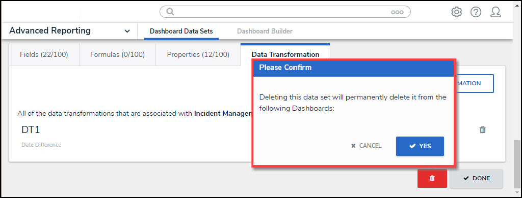 - A Confirmation pop-up will appear listing the Dashboards affected by deleting the Data Transformation. The Confirmation screen indicates that the Data Transformation will be deleted from the following list of Dashboards. A Dashboard Chart will break if the Data Transformation is actively used on a chart in a Dashboard (i.e. x- or y-axis, conditional formatting, etc.). No Core Object data will be affected by deleting a Data Transformation.