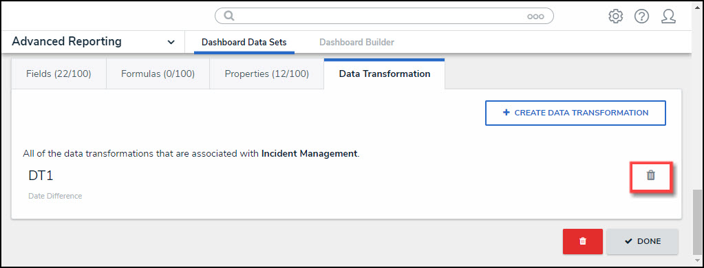 - From the Data Transformation tab, click the Delete icon.