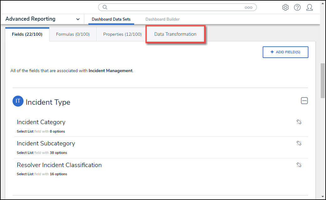 Data Transformations generate new fields to use on a Dashboard by performing basic calculations between two or more fields, formulas, or properties in the Dashboard Data Set.