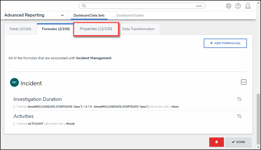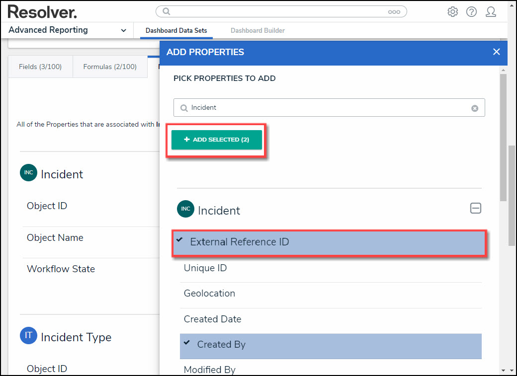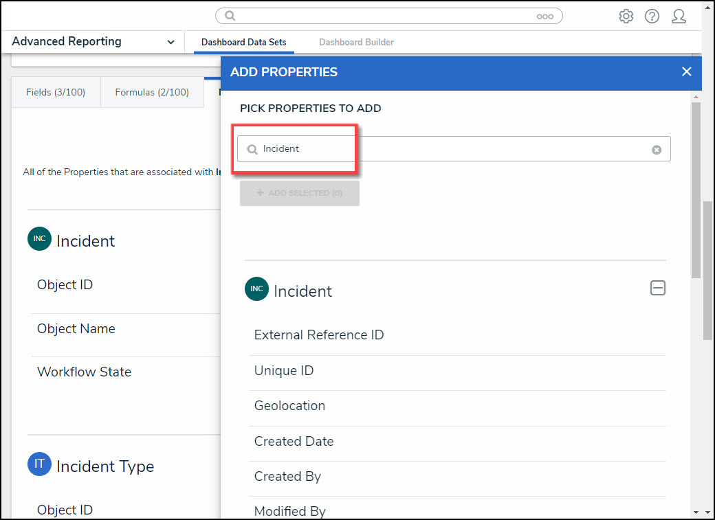 - When you have selected all the Properties to add to the Dashboard Data Set, click the + Add Selected button to add the formulas to the Dashboard Data Set.