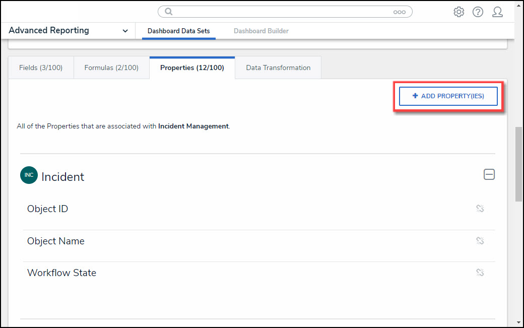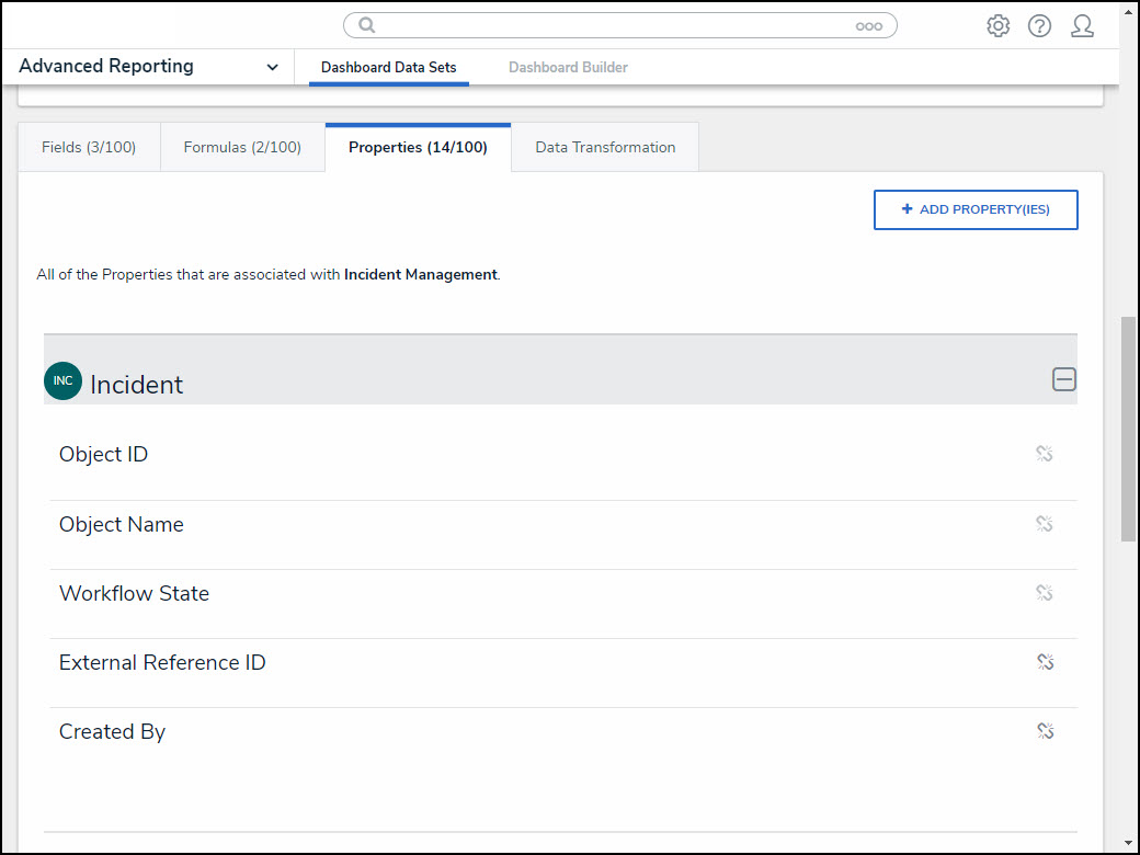 Users can choose up to 100 properties per data set. Object ID, Object Name and Workflow State properties are pre-selected for every Object Type in a Data Set because they are required to support the underlying tables that drive the Dashboard Data Sets and cannot be unlinked.