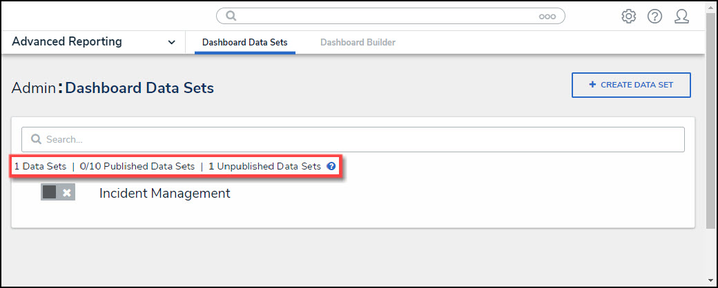 - Unpublished Data Sets: The total number of unpublished Dashboard Data Sets. Unpublished Dashboard Data Sets cannot be used within the Dashboard Builder.
