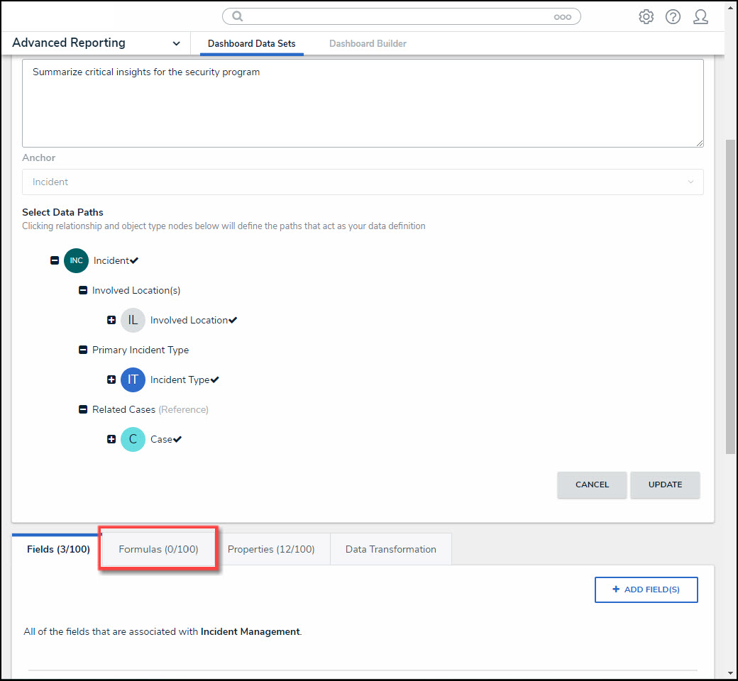 - From the Edit Data Set screen, scroll to the Tabs section and select the Formulas tab.