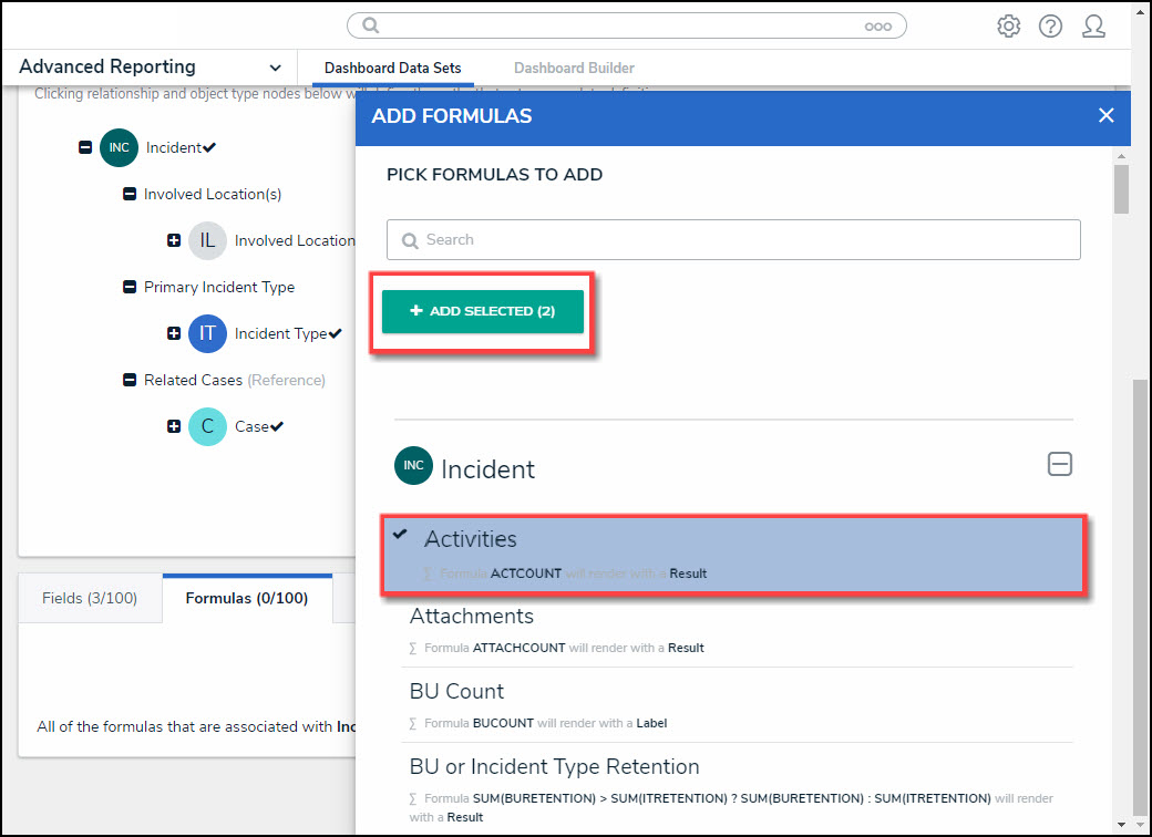 - Select the Formulas you want to include in the Dashboard Data Set by clicking on a Formula. As you add formulas to the Dashboard Data Set, the + Add Selected button at the top of the Add Formulas pop-up will track the number of fields you have selected.