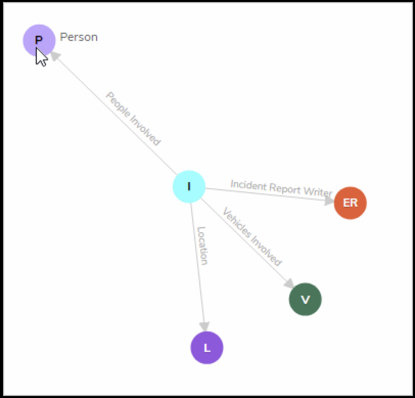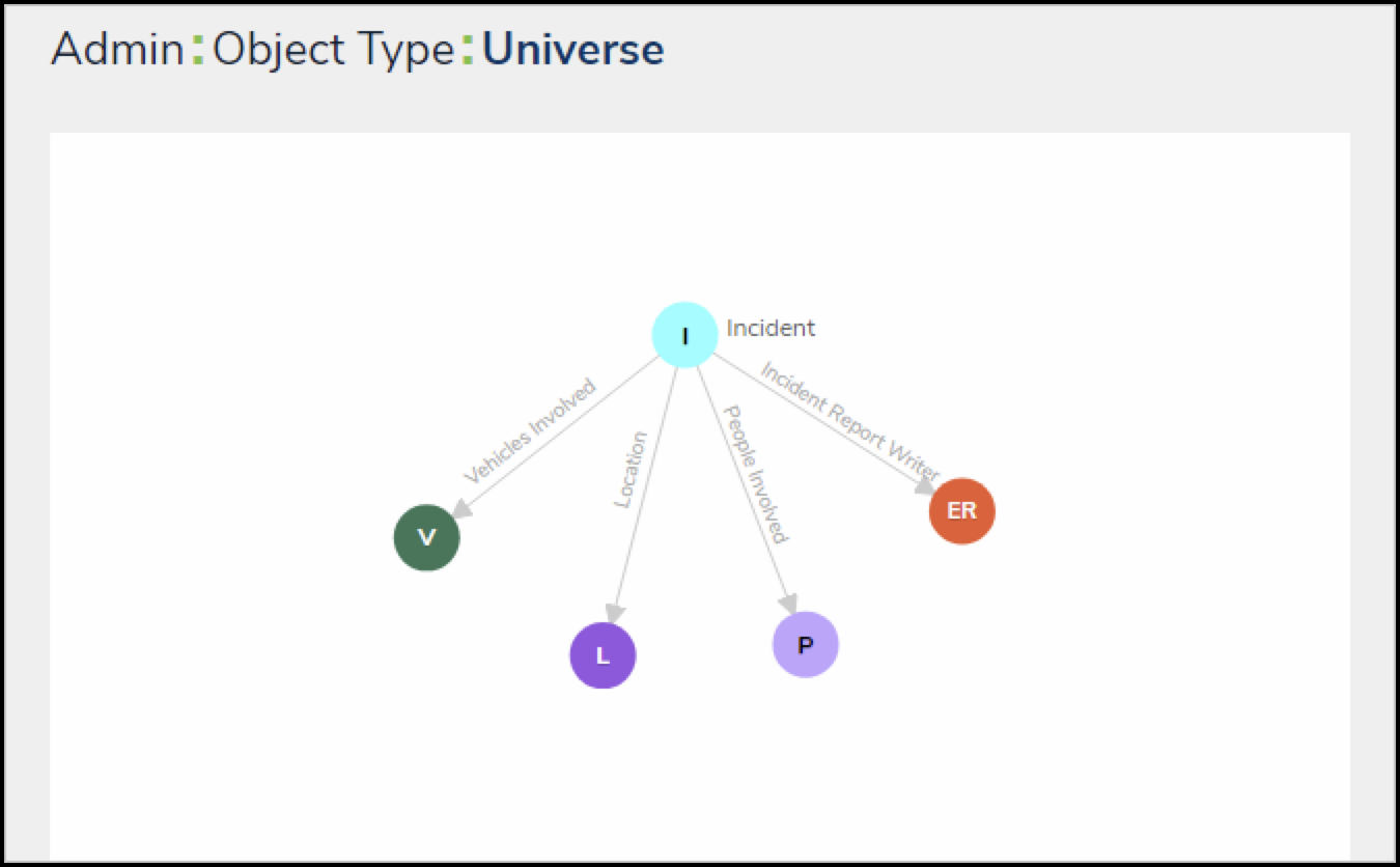 You can reveal the name of an object type by hovering your cursor over the monogram. The gray arrows indicate which object type the relationship is saved to. For example, in the screenshot below, the Incident object type is associated with the Vehicle object type through a “Vehicles Involved” relationship.