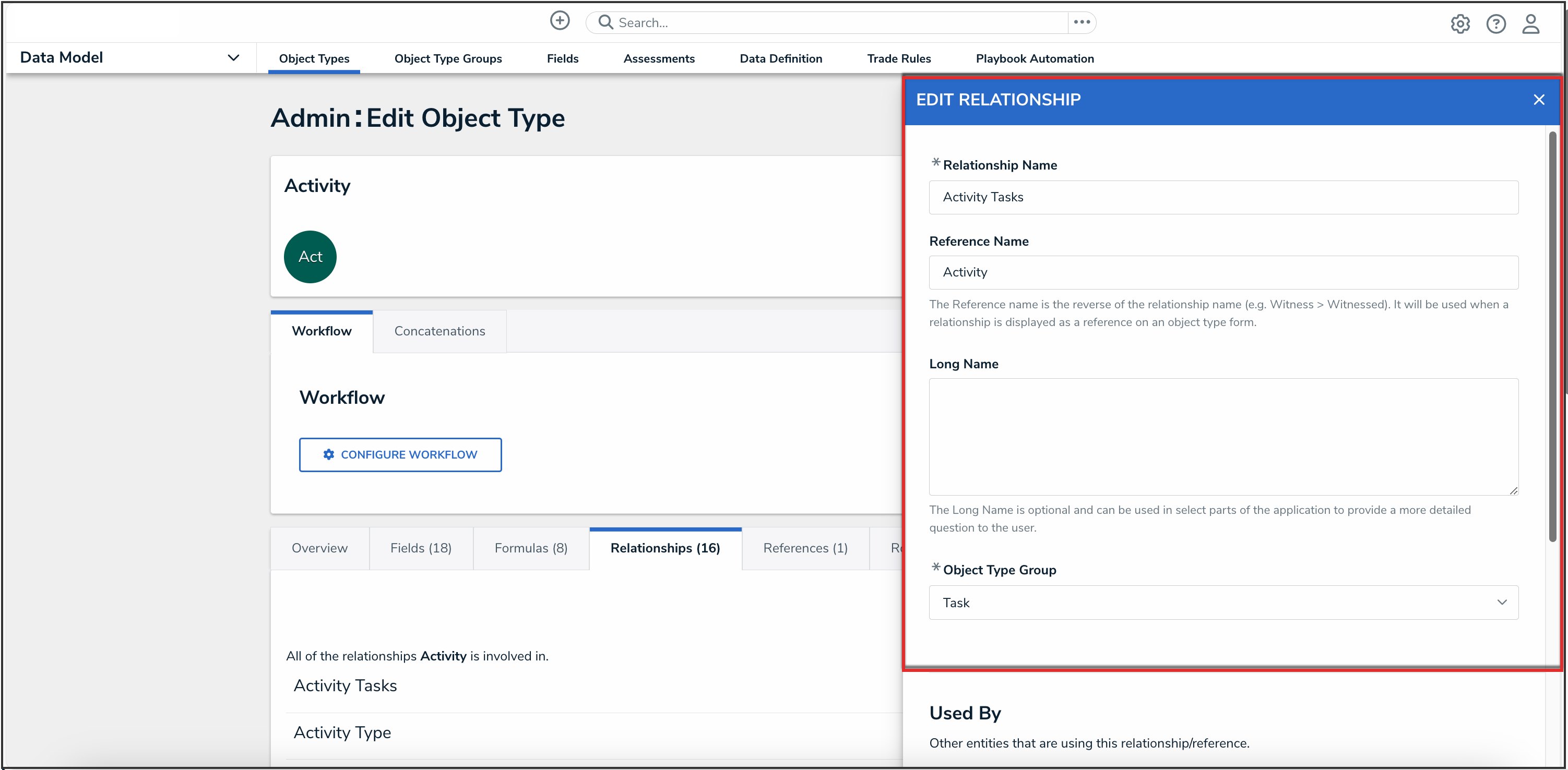 - From the Relationships tab, click the relationship you want to edit. From the Edit Relationship pop-up, you can edit a relationship name, reference name, long name, or object type group.