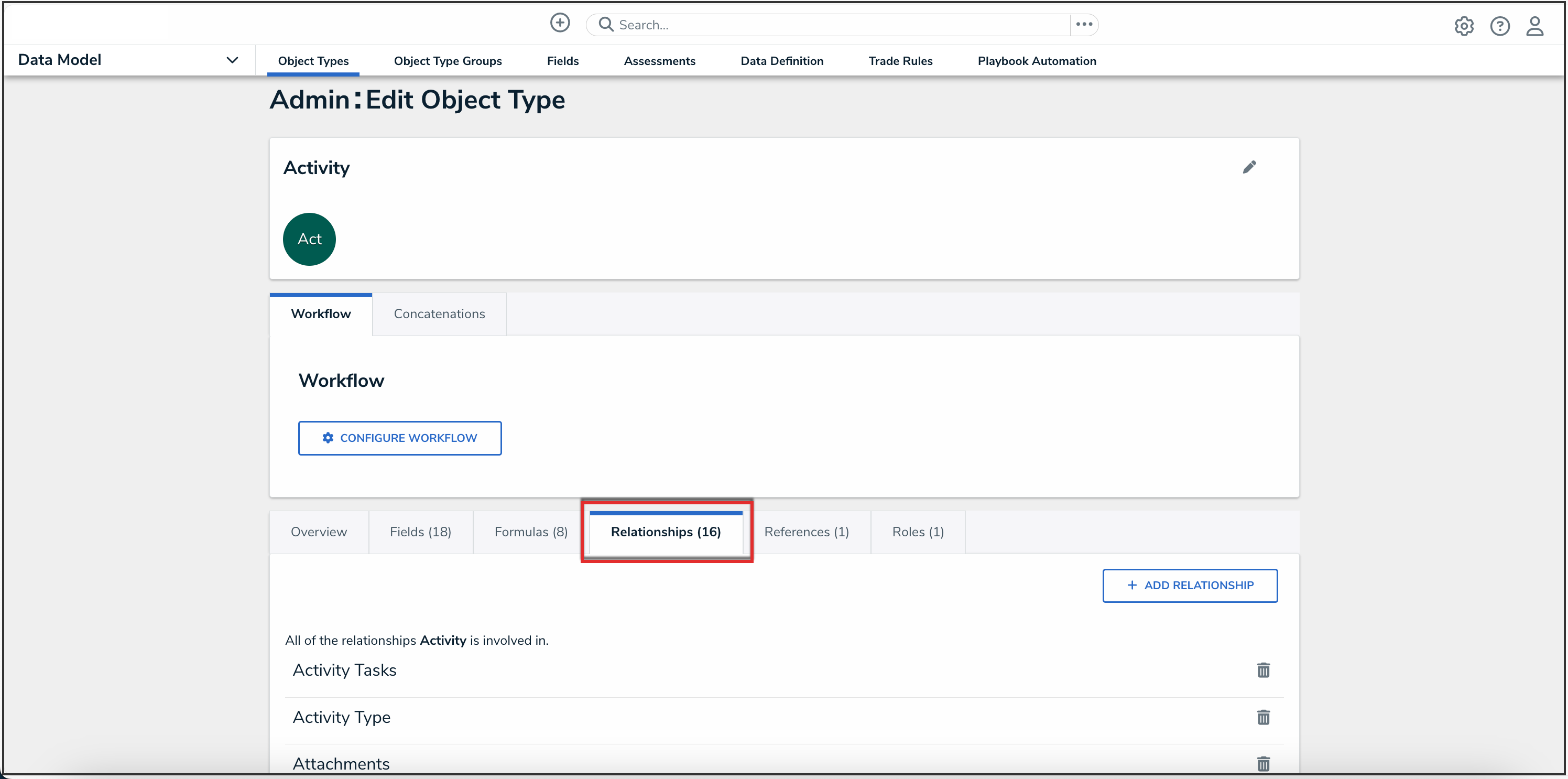 - From the Edit Object Type screen, click the Relationships tab to find the relationship you want to edit or delete.