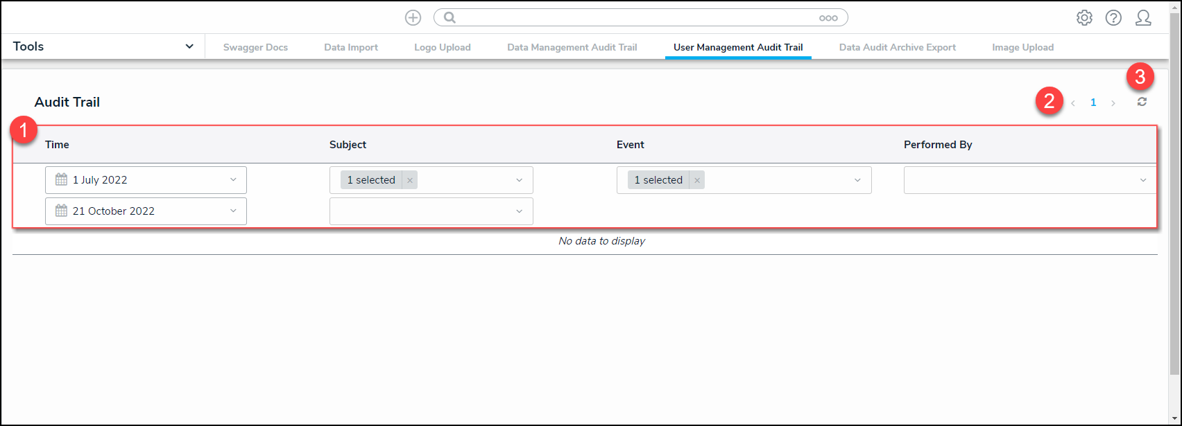 • Refresh Icon (3): Located in the top right-hand corner of the Audit Trail table.