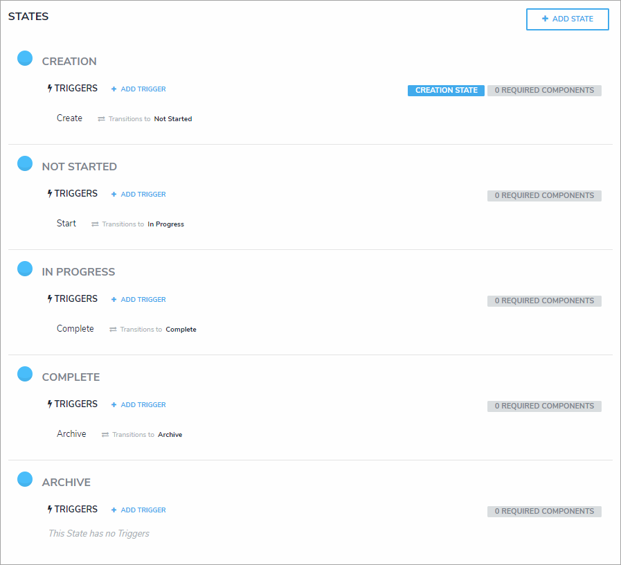 - Creation: Contains a Create button trigger that transitions the object to the Not Started state. This state cannot be deleted, nor can its name or color be edited, however, the trigger can be edited or replaced as needed.