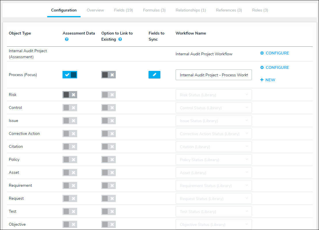 Note: You cannot create or configure workflows for object types added to assessments unless the Assessment Data option is enabled. Additionally, disabling Assessment Data for a root object type will also disable the option for any leaf (relationship or reference) object types in the data definition. |