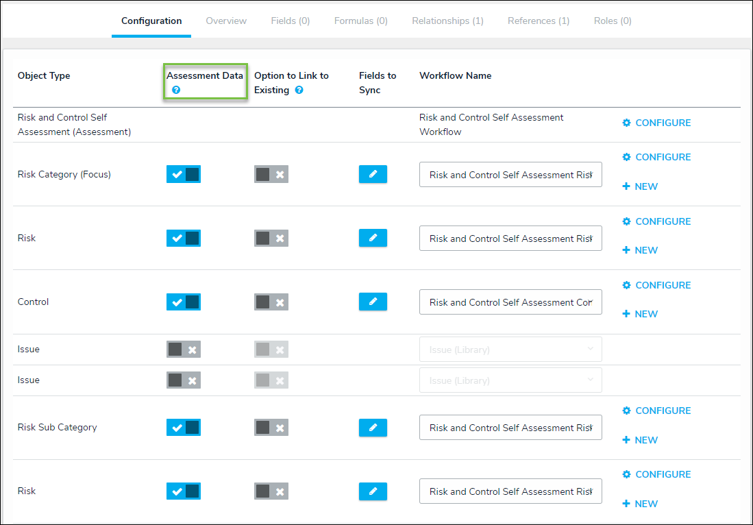 If objects in an assessment should not have instances (new versions) created and should only be used as references, admins can deselect the Assessment Data toggle beside an object type from the Configuration tab of the Edit Assessments page. This toggle is enabled for each object type by default.