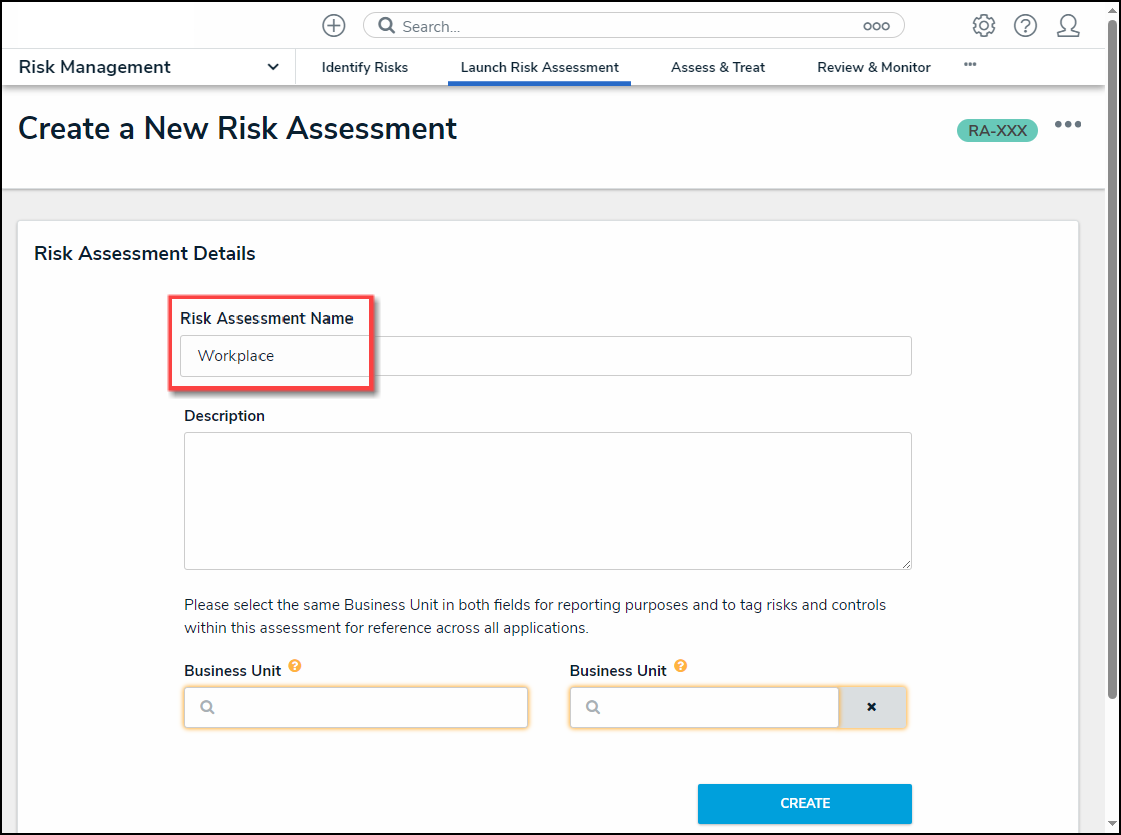 - From the Create a New Risk Assessment screen, enter a name for the Risk Assessment in the Risk Assessment Name field. The Risk Assessment name identifies the Risk Assessment throughout the system.
