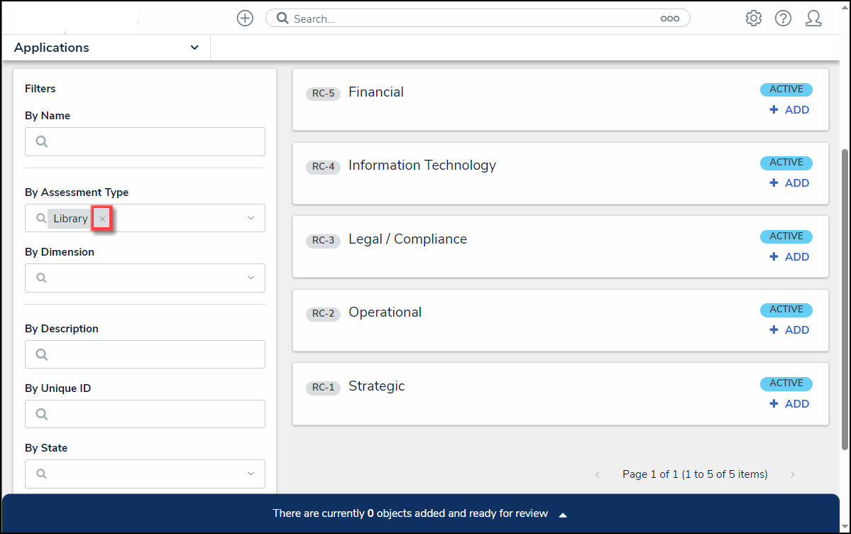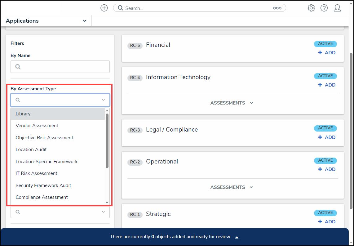 - (Optional) Use the Filter fields to narrow the search results by entering the corresponding keyword in the Filter field (e.g., Library in the By Assessment Type field) and selecting a filter from the dropdown list.
