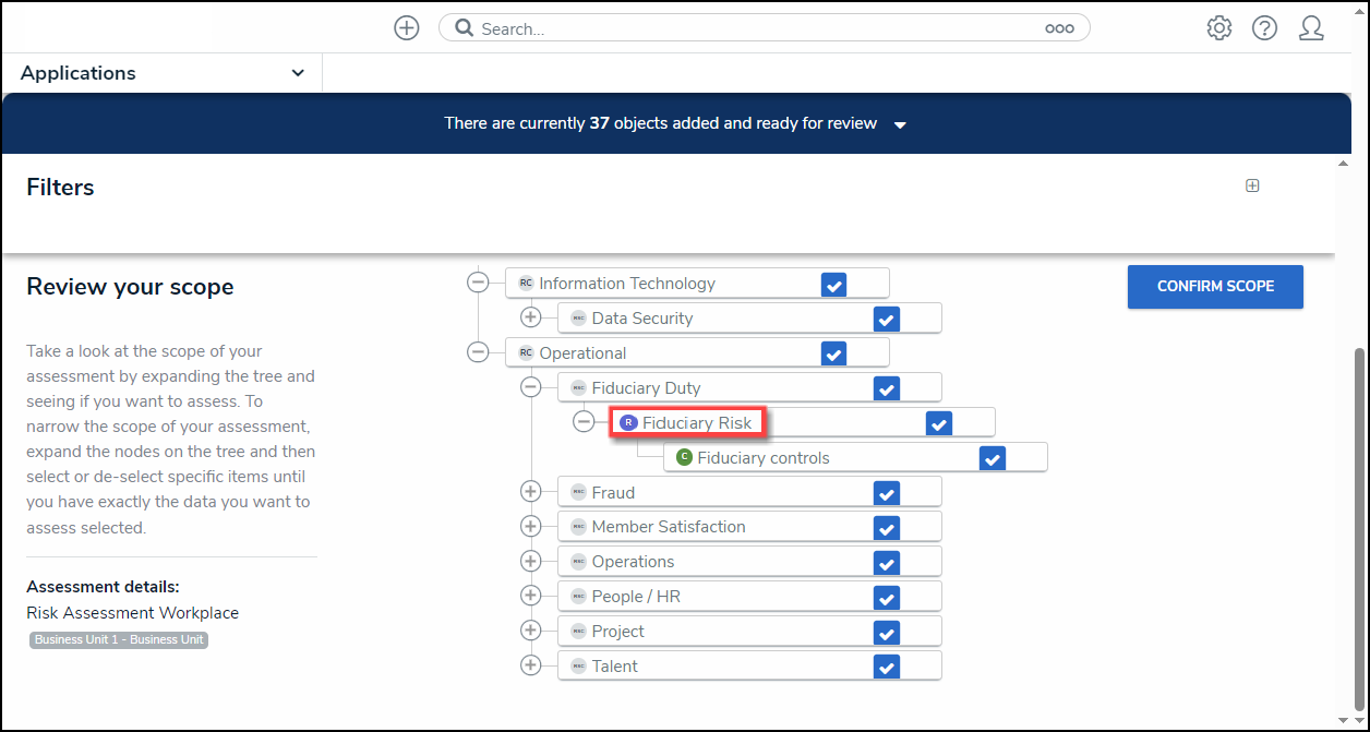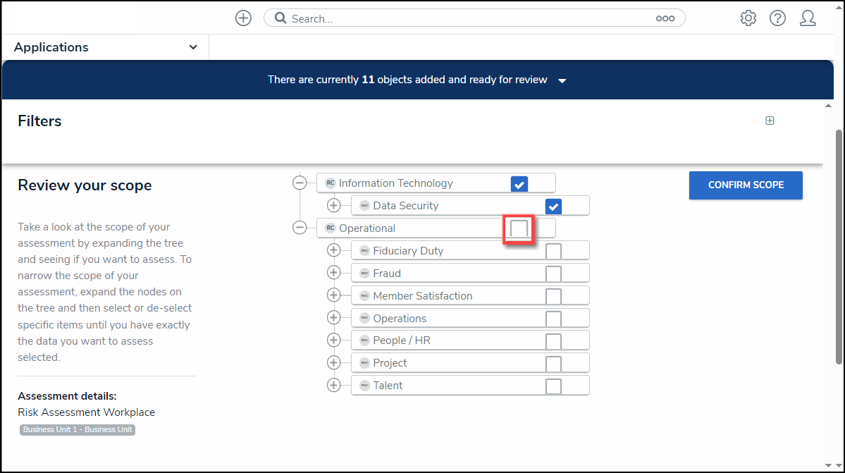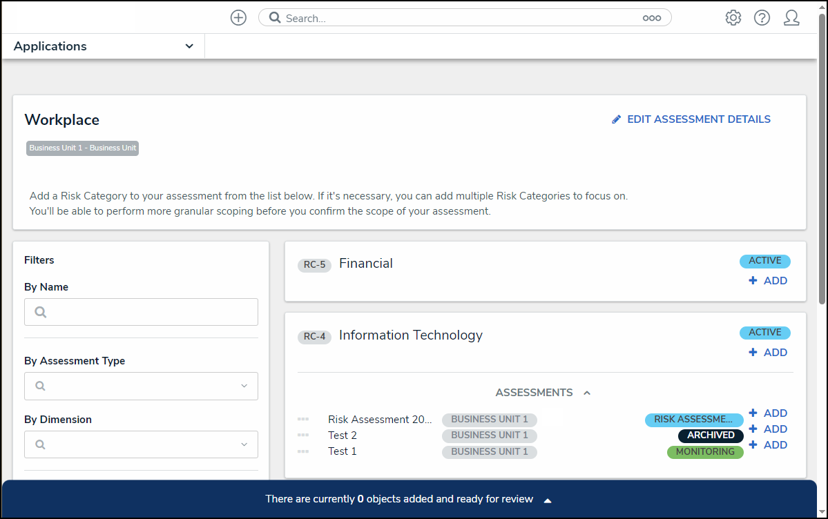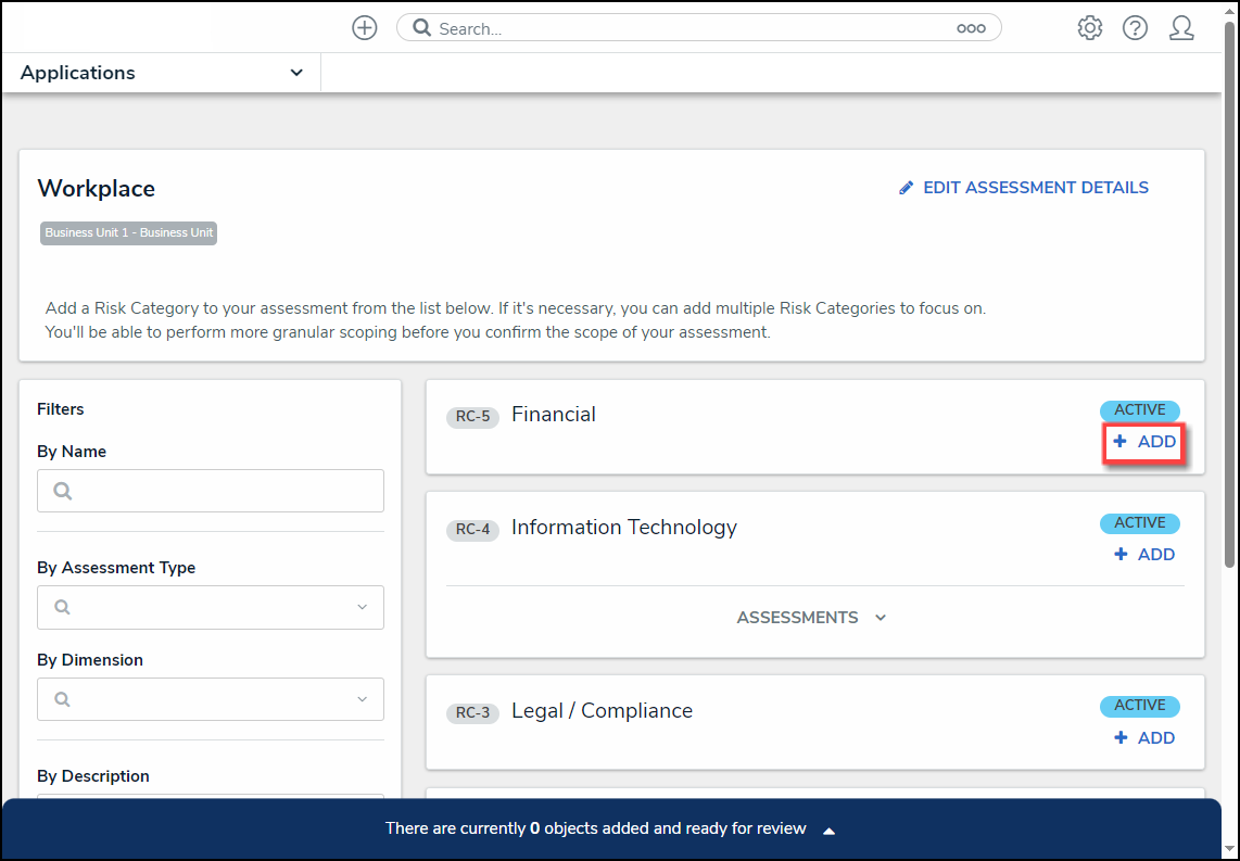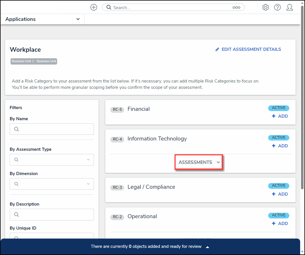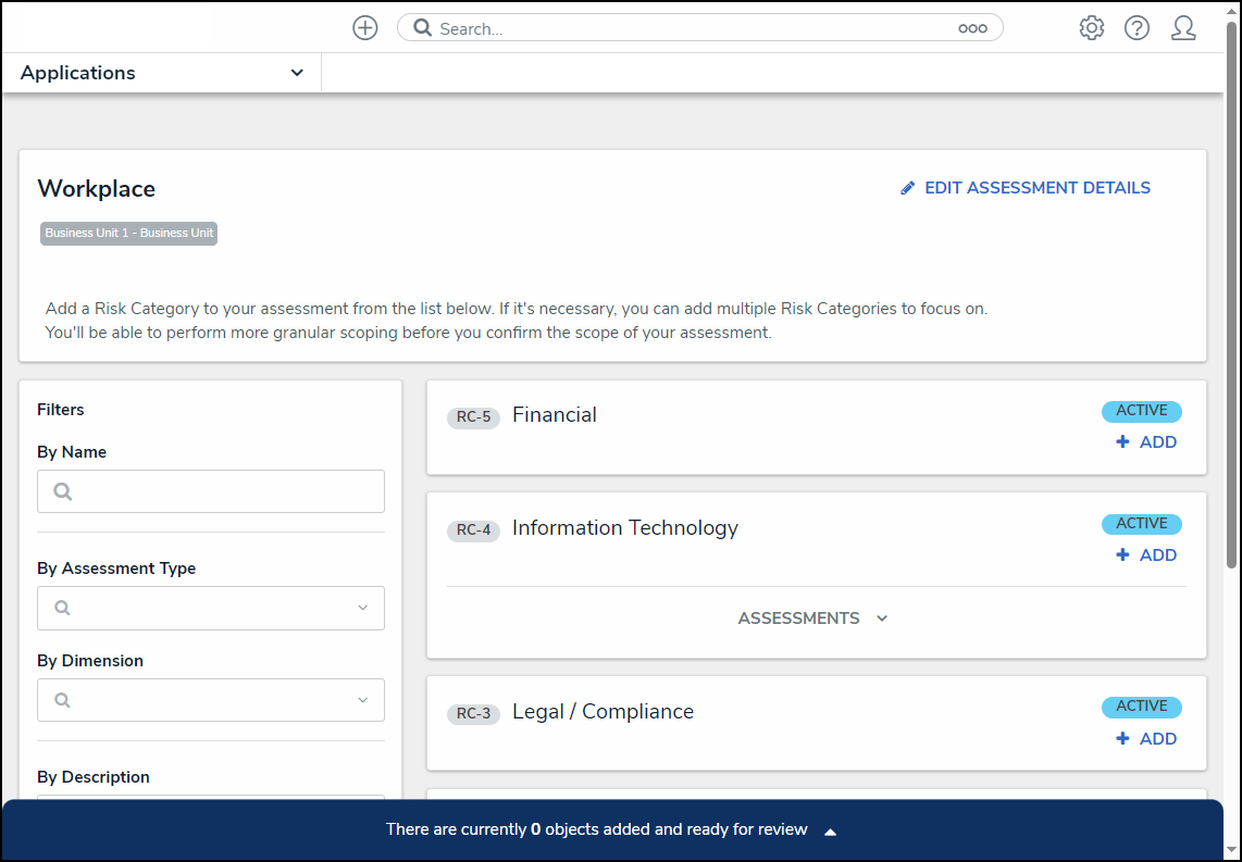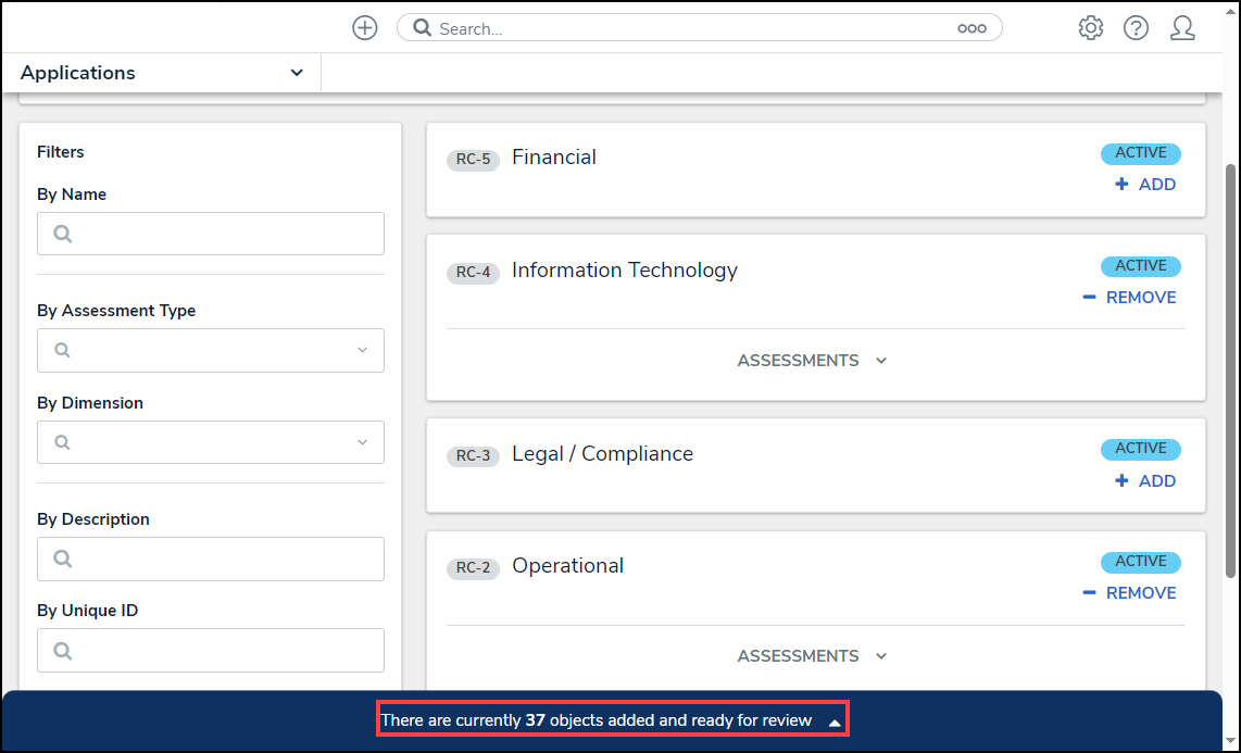 - As you add risk categories, processes, or objectives, the banner at the bottom of the screen will track the number of objects added to the assessment for review.