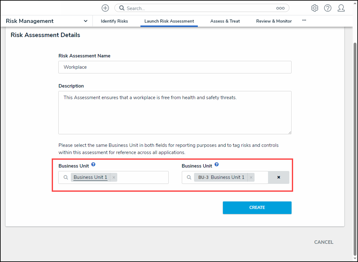 - Enter the business unit used in the first Business Unit field in the second Business Unit field and select a business unit from the dropdown menu. The second Business Unit field is for reporting and establishes a link between the business unit and assessment.