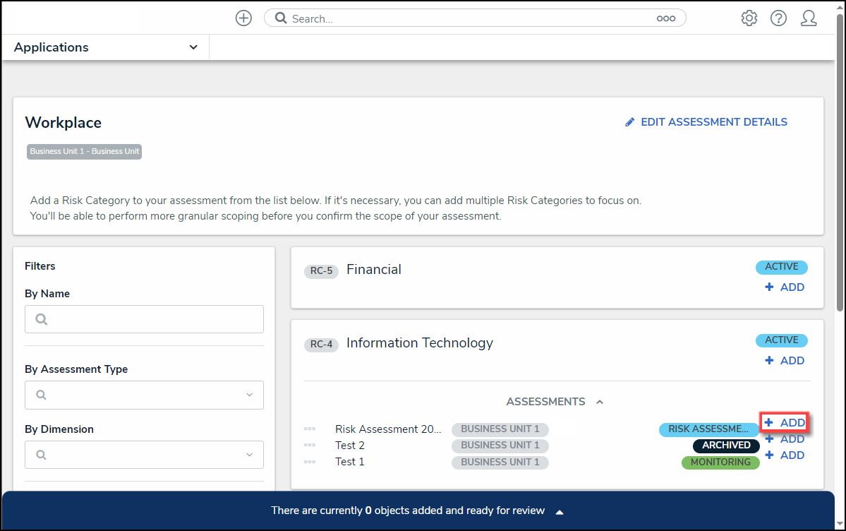 - Click the +Add link on risk categories, processes, or objectives to create the assessment focus. Users can select multiple risk categories, processes, or objectives to add to the assessment.