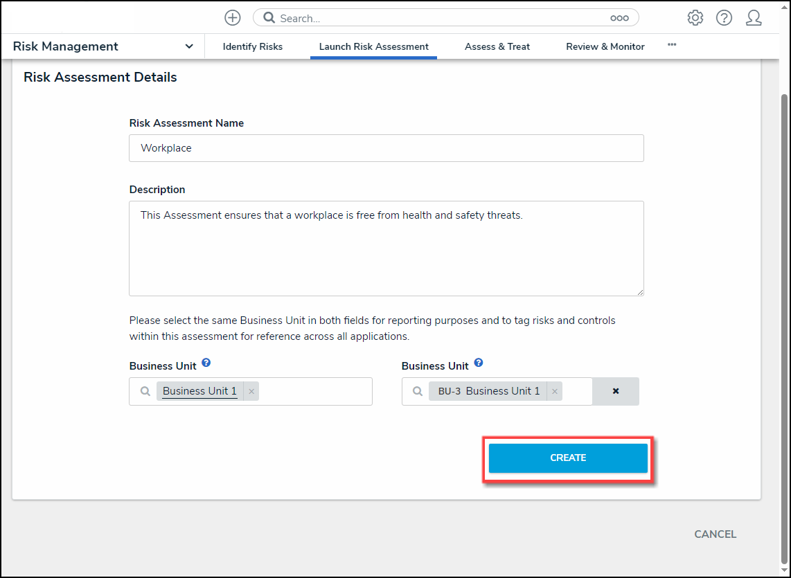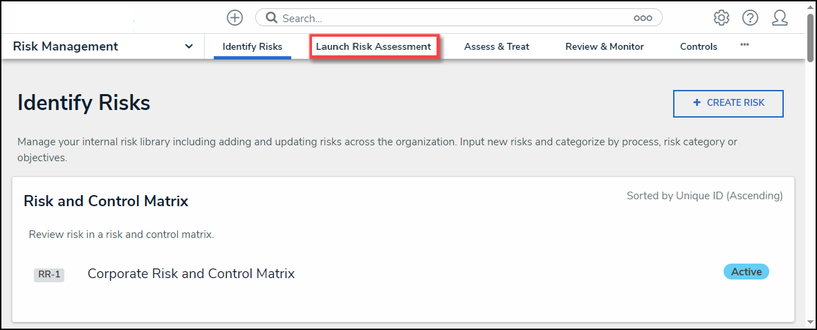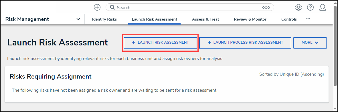 - From the Launch Risk Assessment screen, click the + Launch Risk Assessment button.
