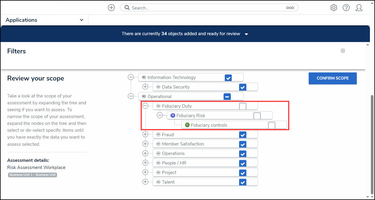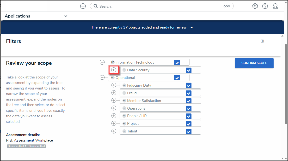 - Review the assessment's scope by clicking the Expand icons on the Navigation Tree Nodes to review the object's relationships and references. Data Definitions determine the objects that appear on the Navigation Tree.