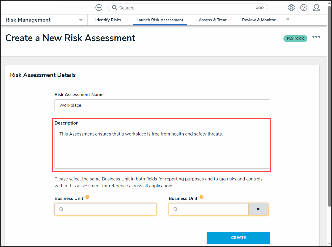 - Enter a brief description outlining the Risk Assessment in the Description field. The Description field allows you to enter additional information about the Risk Assessment.