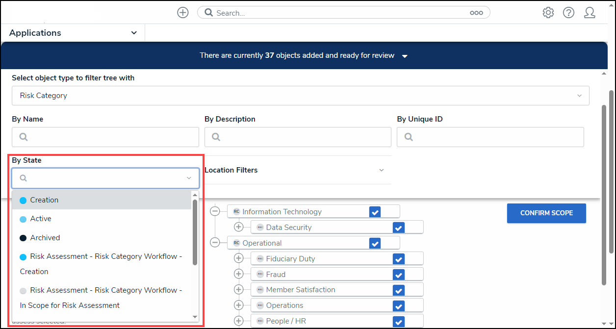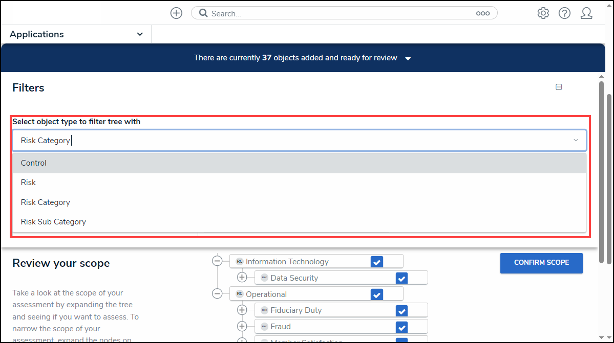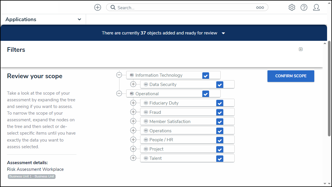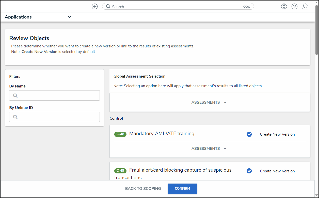 - If an Administrator enabled the Link to Existing feature on the Configuration tab on the Admin: Editing Assessment screen, and you have the appropriate user permissions. Clicking the Confirm Scope button will open the Review Objects screen, allowing the user to review the data before the assessment is launched.