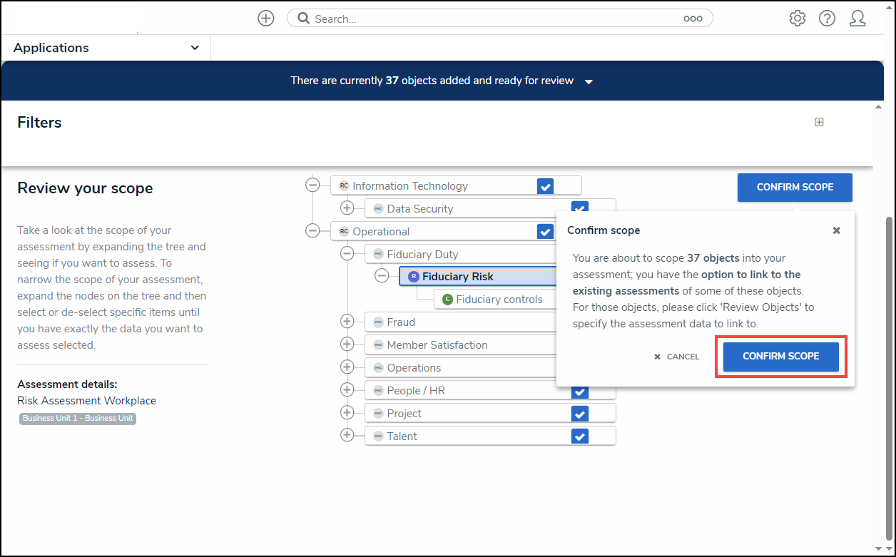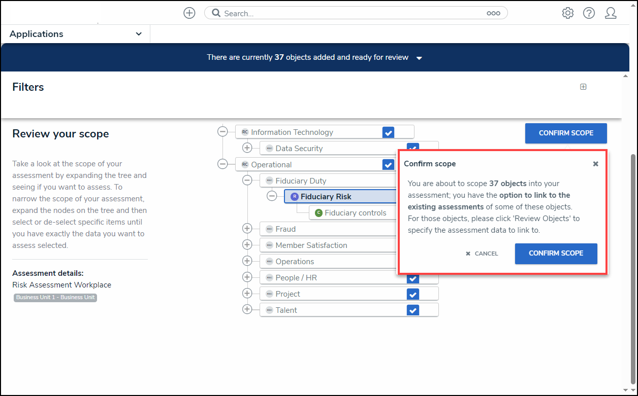 - The Confirm Scope pop-up will appear, indicating the number of objects in the assessment and if the option to link to existing assessments exists.