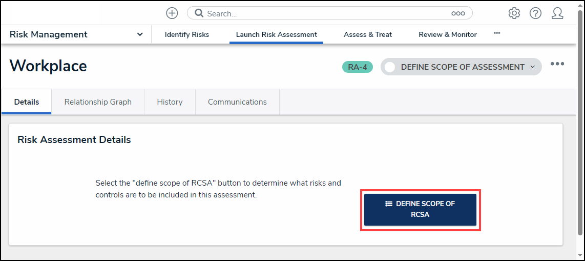 - From the Risk Assessment Details tab, click the Define Scope of RSCA button to add risks and controls to the assessment.