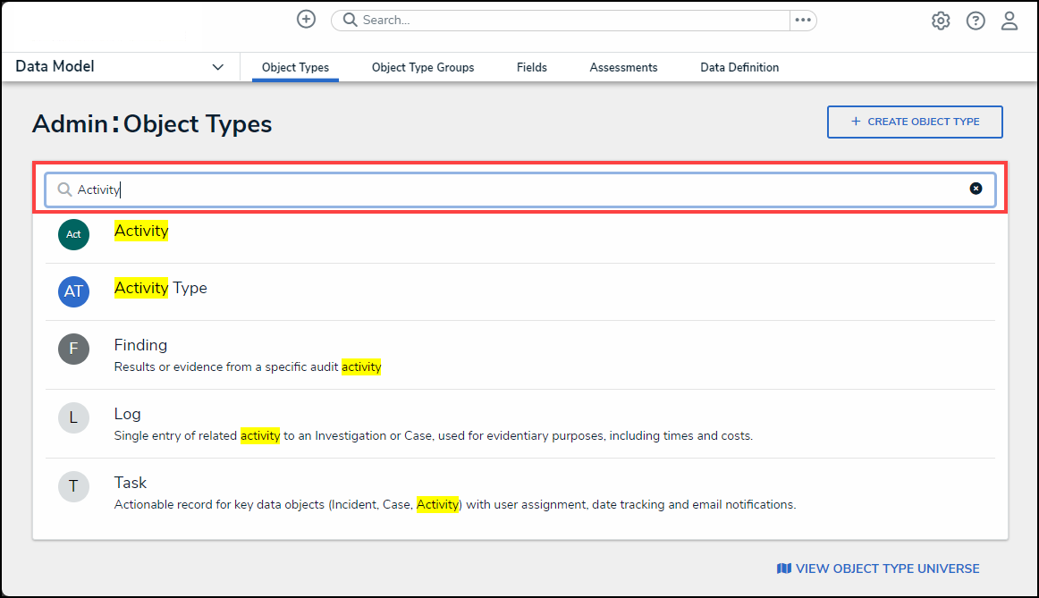 - From the Admin: Object Types screen, enter a keyword in the Search field to narrow the Object Types list.