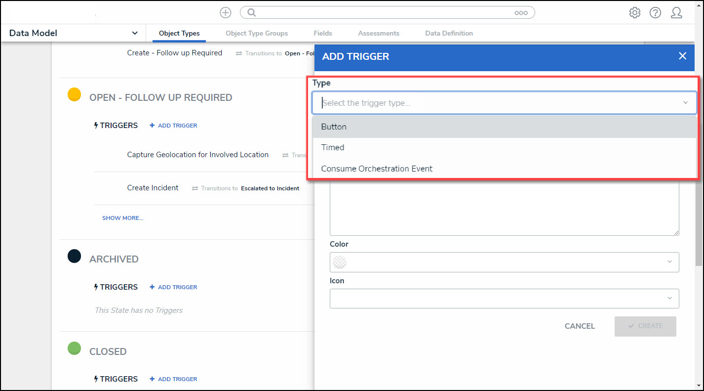Consume Orchestration Event: The consume orchestration event trigger type uses an existing state or object type’s send orchestration event action to automatically transition an object to another predefined state (e.g., Closing an audit object will also automatically close all issue objects in an Open state).