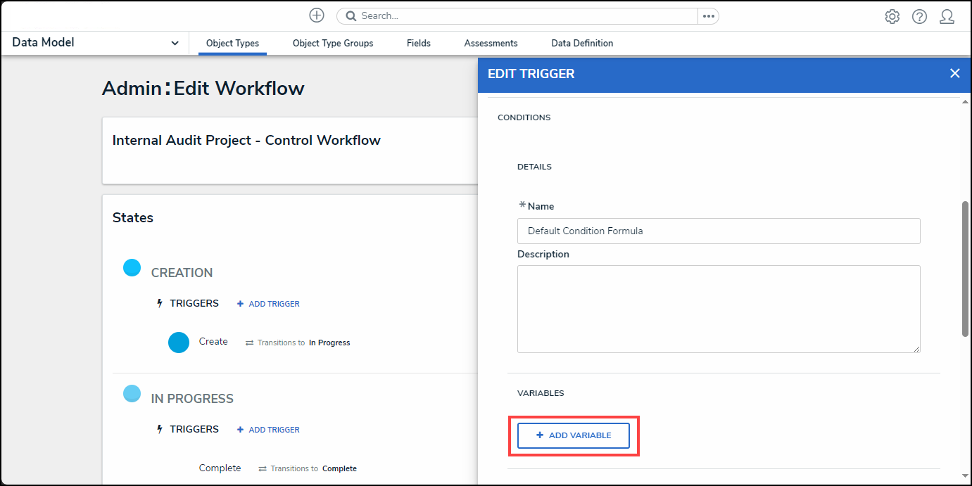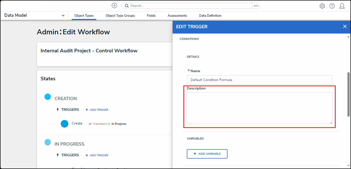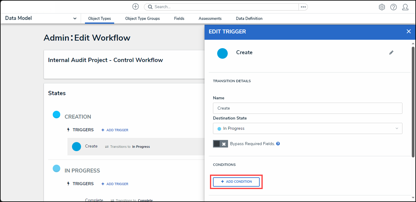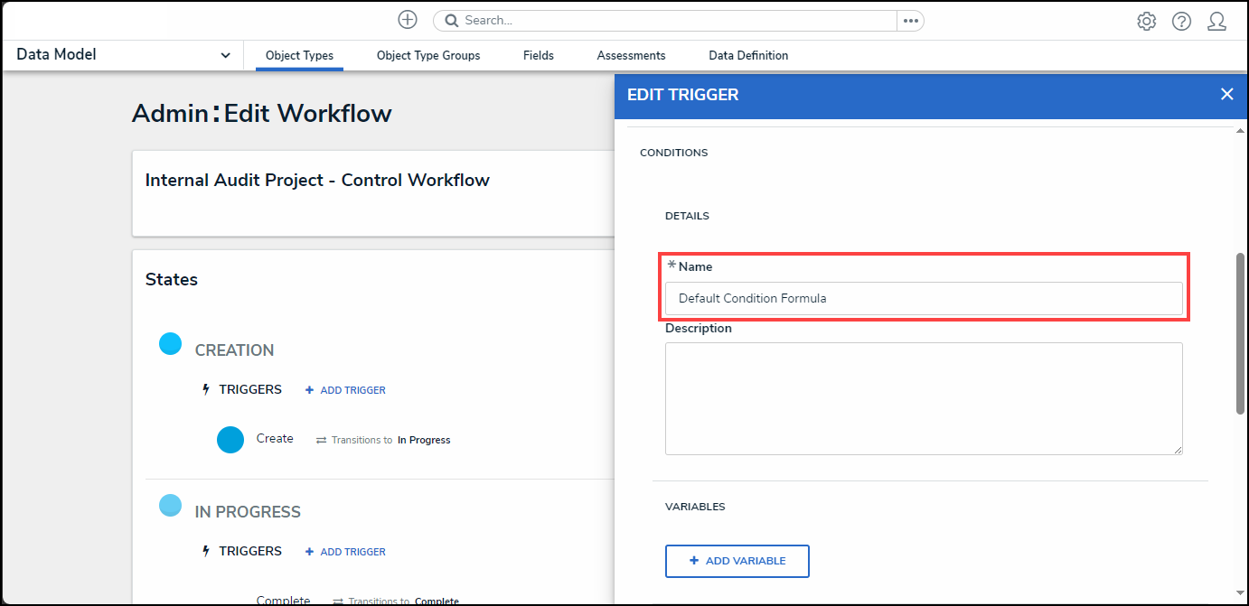 A Condition controls an object's movement to different states or performs a specific action. A Condition consists of fields, formulas, and workflow states that create a formula. The formula uses a set of parameters to control whether a transition or action can occur.