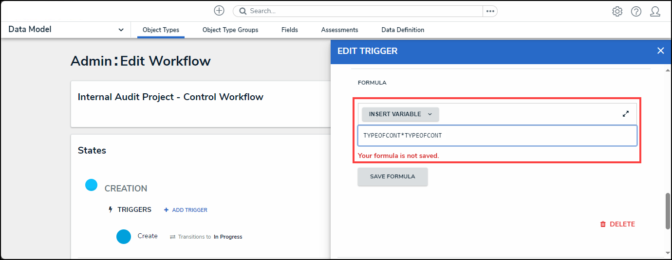 - A system notification will appear under the Formula field, indicating that Your formula is not saved.