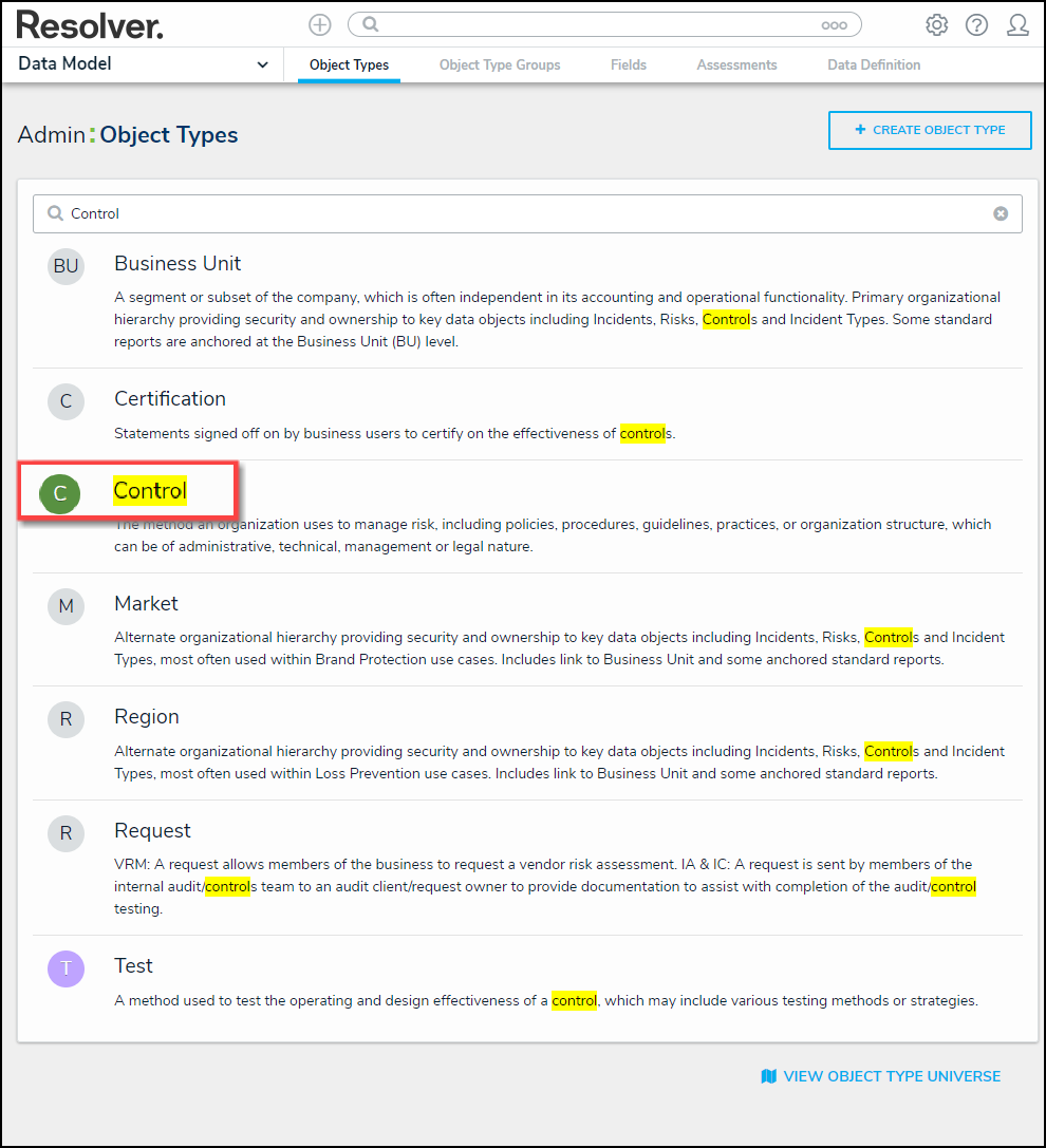 - From the Object Types screen, enter an Object Type Name in the Search field to narrow down the list.
