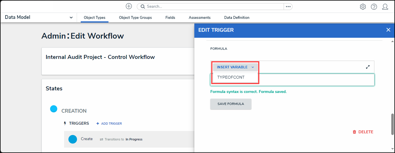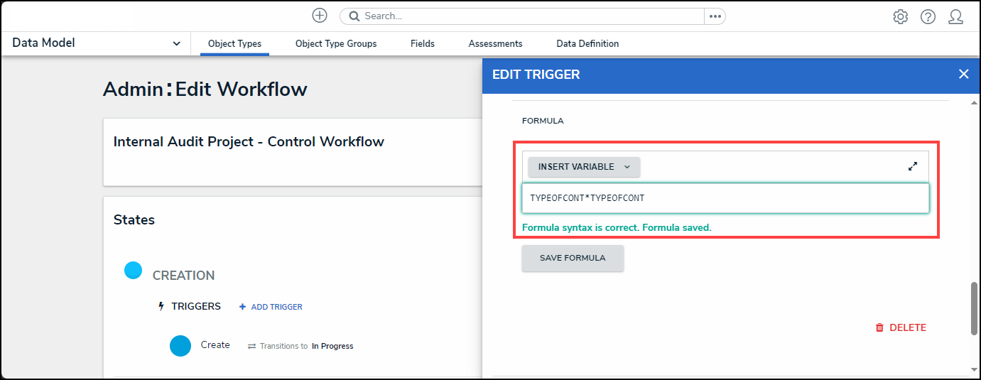 - Valid: A system notification will appear under the Formula field; Formula syntax is correct. Formula saved.