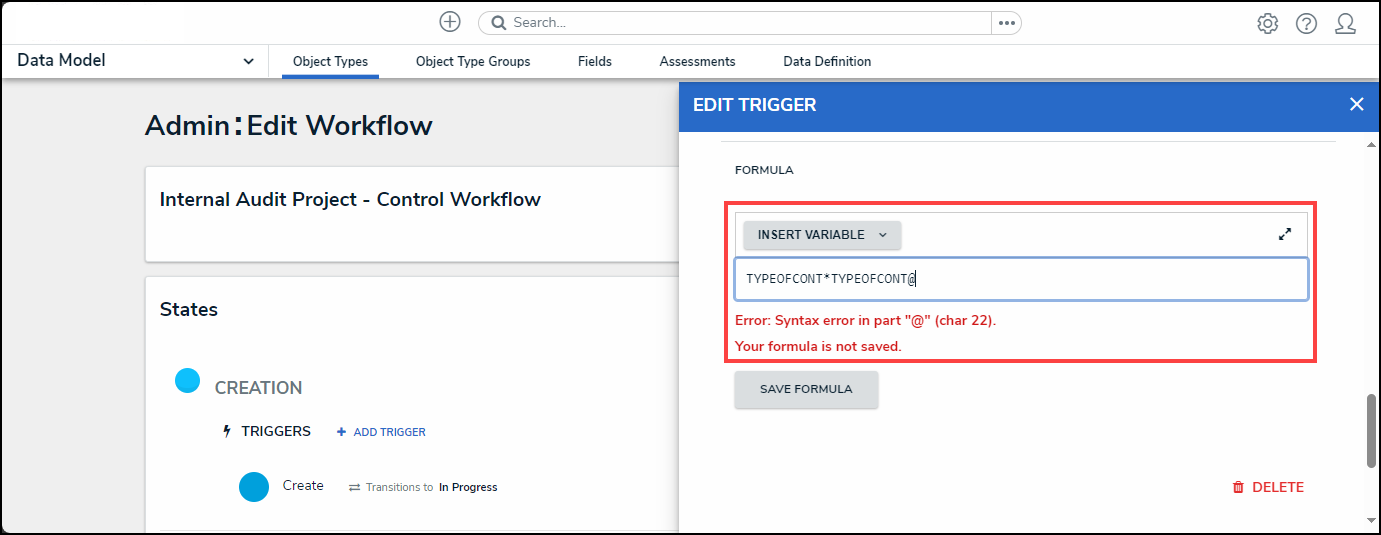 - Invalid: A system notification will appear under the Formula field; Error Syntax error in part (char 1). The formula is not saved. The error will indicate the character (char) location of the error in the formula and that the formula is invalid and not saved.