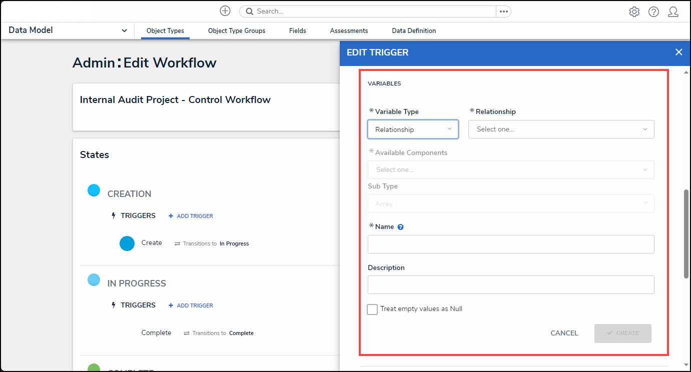 - Relationship: Select the Object Type Relationship from the drop-down list. Relationships connect two or more objects. Relationships must be added to an Object Type to appear on the Relationship drop-down list. See the Add Relationships to an Object Type article for further information on adding a Relationship to an Object Type.