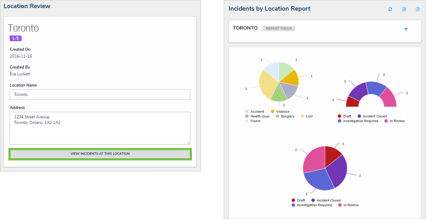 Clicking on a data visualization action on an existing object will display a related data visualization. In this case, clicking View Incidents at This Location will display the Incidents by Location Report with the Toronto object as its focus.