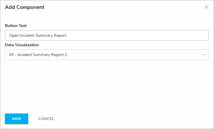 The Open a data visualization action element allows end users to open a data visualization directly from an object instead of through a view. For example, if this action was added to a standard form for the Location object type and a user was working in a location object, they could click the "View Incidents at this Location" action button to view a report that outlines details about the incidents that occurred in that city.