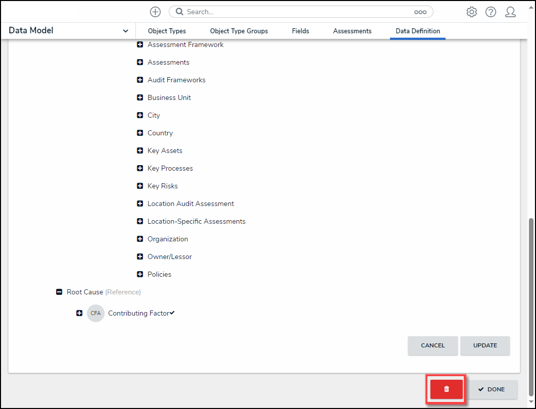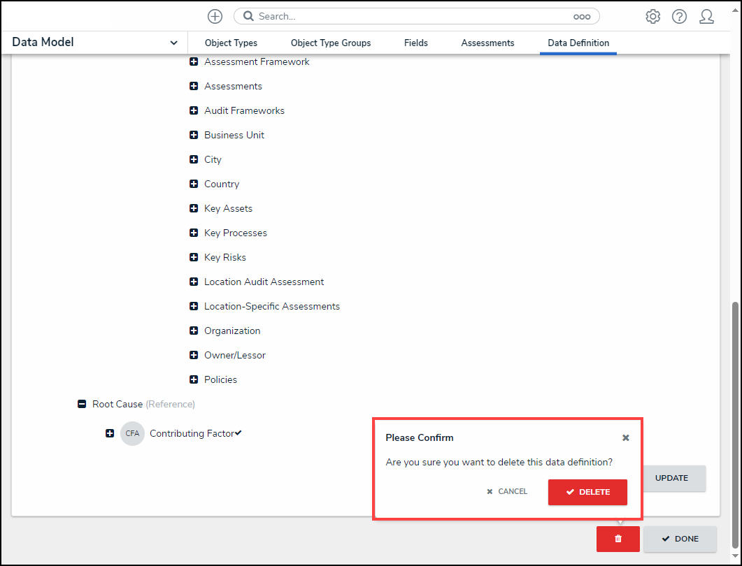 An active Data Definition can be deleted from Resolver if you remove the Data Definition from the Data Visualization or Assessment. You will receive a system-generated message indicating that the Data Definition is currently in use if you try to remove a Data Definition before removing it from the Data Visualization or Assessment.