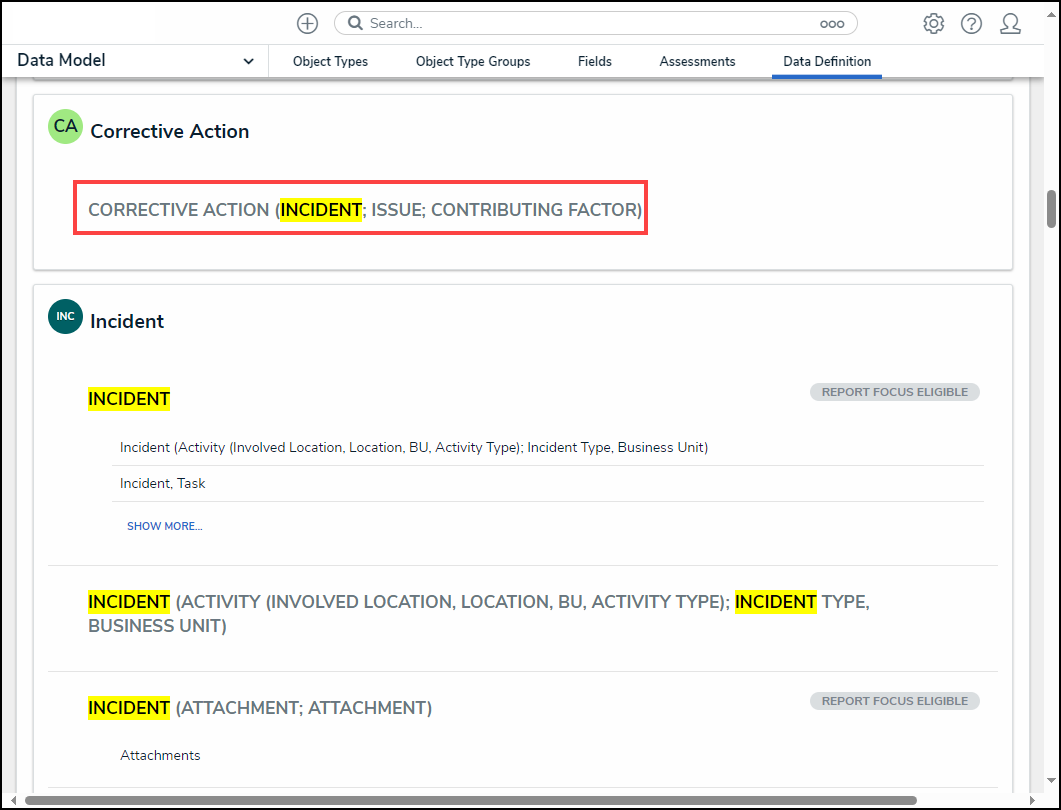- From the Admin: Data Definition screen, enter a keyword in the Search field to narrow the Data Definition list.