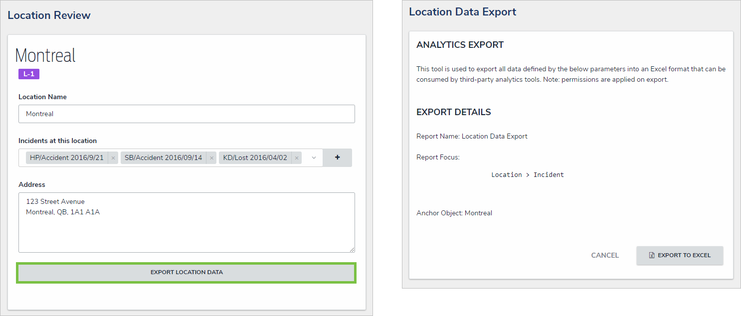 When the Export Data action is added to a standard form, it allows users to open a Data Analytics Export report directly from an object instead of an activity view or action. These report types are specifically designed to export object data (properties, fields, workflow states, relationships, and references) into an Excel spreadsheet and therefore do not display object data through report elements.