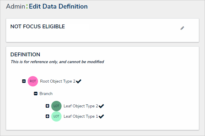 A data definition cannot be focus eligible if more than one unique object types on the same level have been selected. More specifically, when creating a focus eligible definition, you can only select one unique leaf (object type) per each branch in the data path tree.