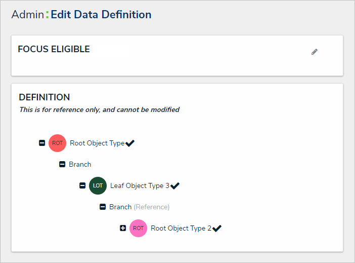 A focus eligible data definition. This data definition is eligible because only one leaf (object type) has been selected per each branch on the data path.