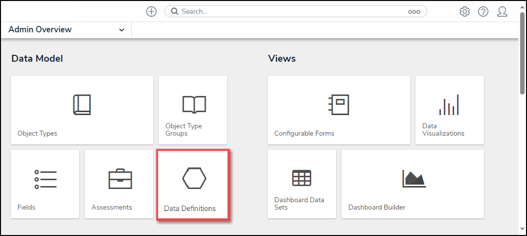 - From the Admin: Overview screen, click the Data Definitions tile on the Data Model section.