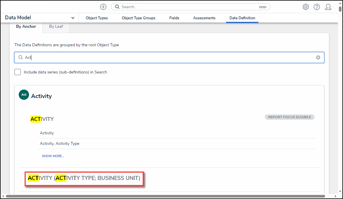 - From the Admin: Data Definition screen, enter a keyword in the Search field to narrow the search results.