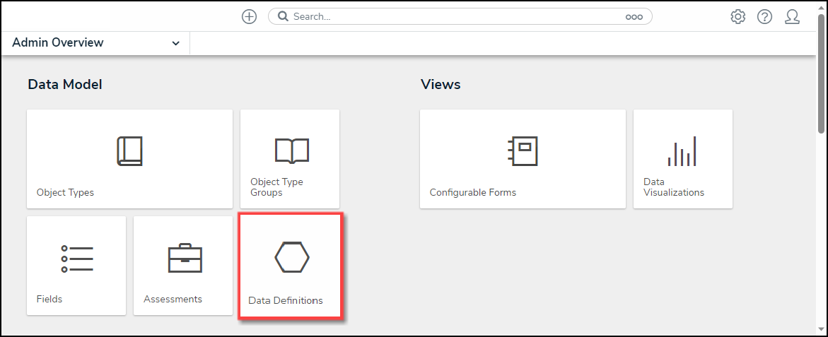 - From the Admin: Overview screen, click the Data Definition tile under the Data Model section.