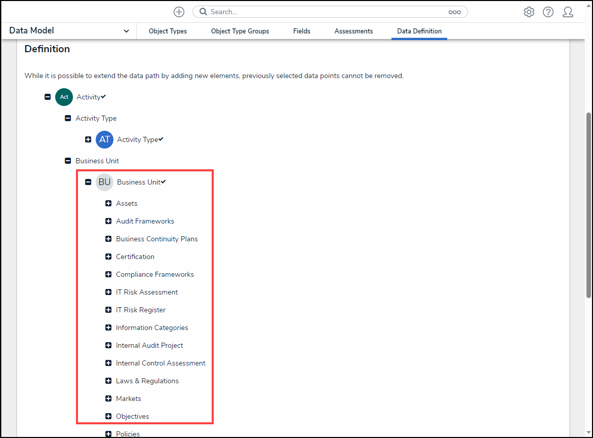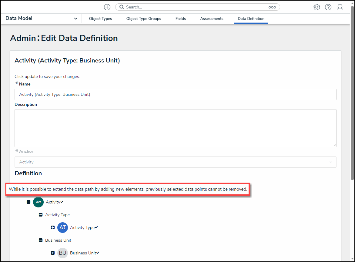 - From the Admin: Edit Data Definition screen, a system-generated message will appear under the Definition section indicating if you can add a new element to the Data Definition.