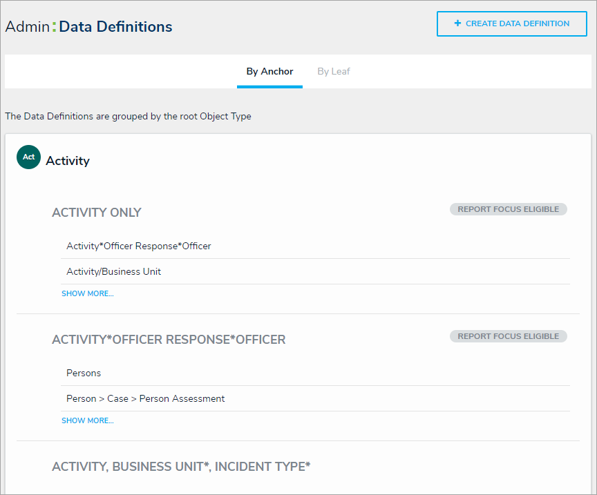 When the By Anchor tab is selected, the data definitions are organized alphabetically first by the anchor (root) object type, focus eligible definitions, then data series (sub-definitions). Clicking on a definition or data series will display the Edit Data Definition page where you can review the data path and edit the definition name and/or description.