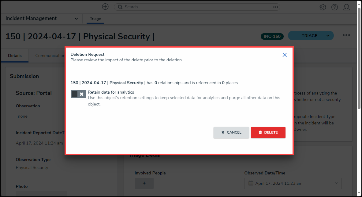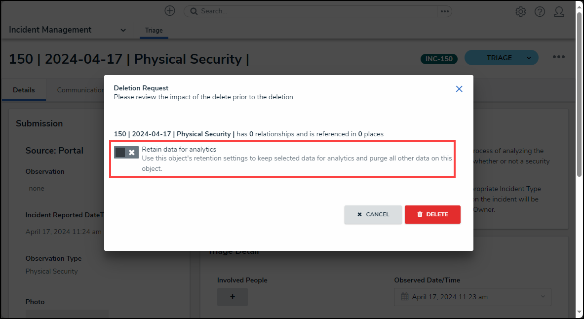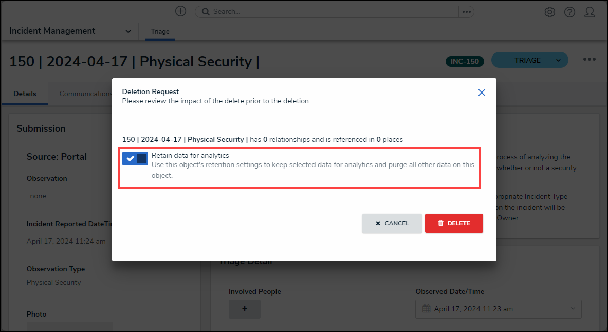 - If the Retain Data for Analytics toggle switch on the Data Retention tab is activated for the object type, the following Confirmation screen will appear when deleting an object.