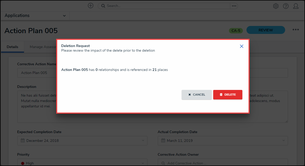 - Read the warning, as it will outline the number of relationships and references that will be impacted if the object is deleted from the system.