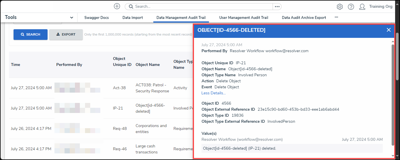 Warning: When an object is deleted, it no longer exists and cannot be reverted. Specific object data can be retained for analytical purposes and must be setup on the object type. |