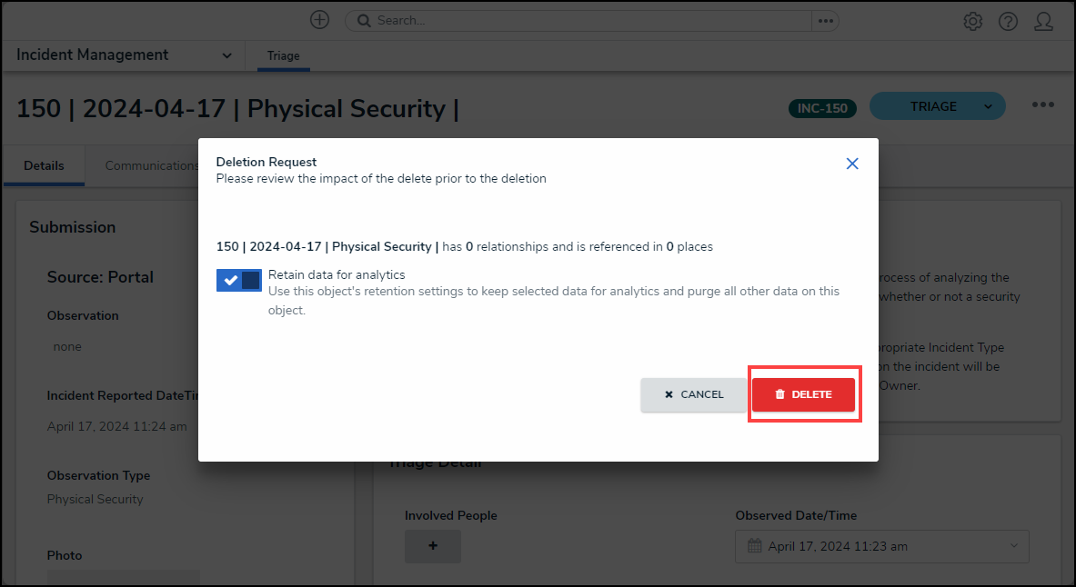 - (Optional) Leave the Retain Data for Analytics toggle switch deactivated to delete the object and all related data from the system.